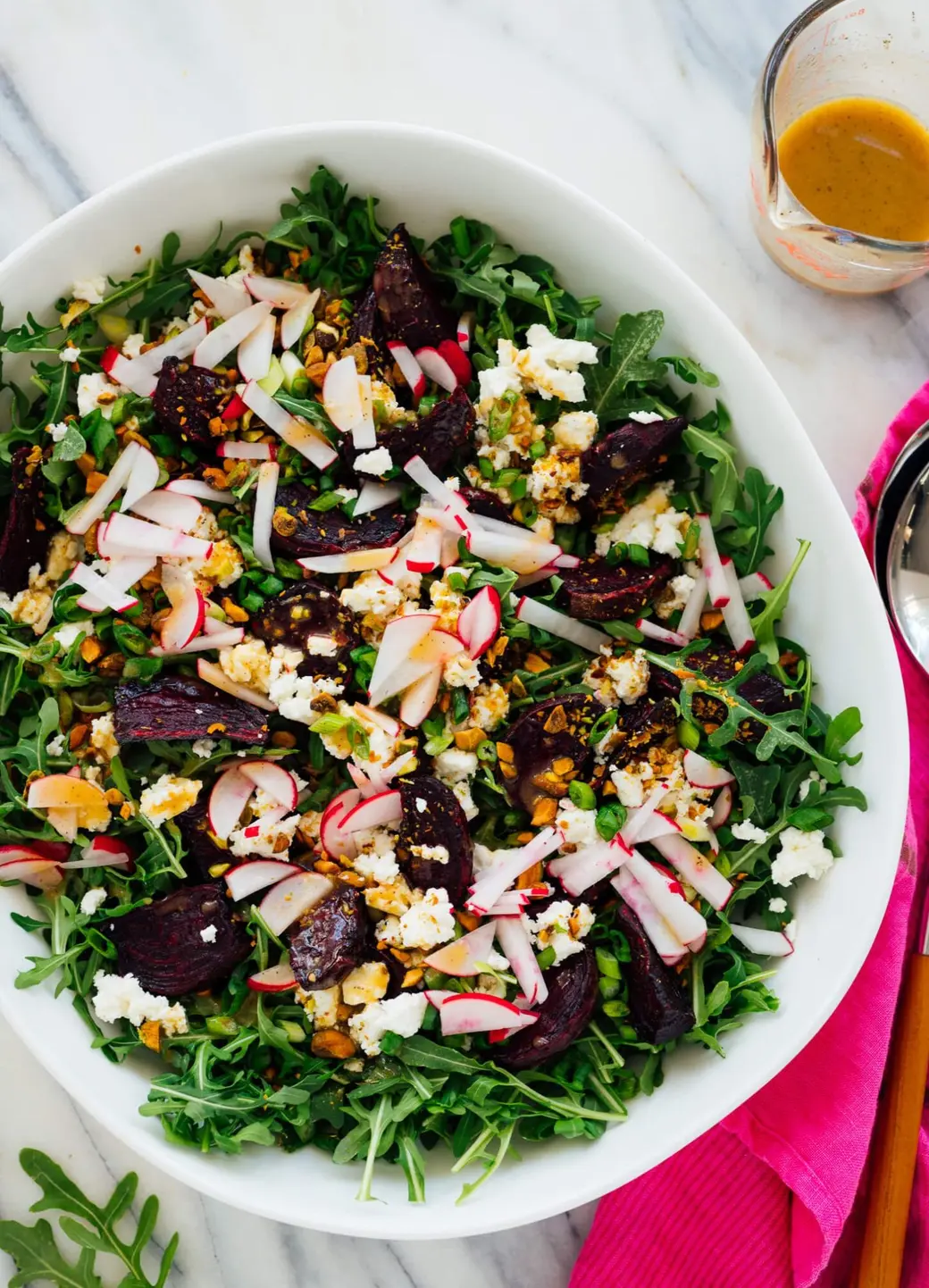 - To assemble the salad, place the arugula in a large serving bowl or platter. Scatter the roasted beets on top, followed by the crumbled goat cheese, chopped pistachios, radishes and green onion.